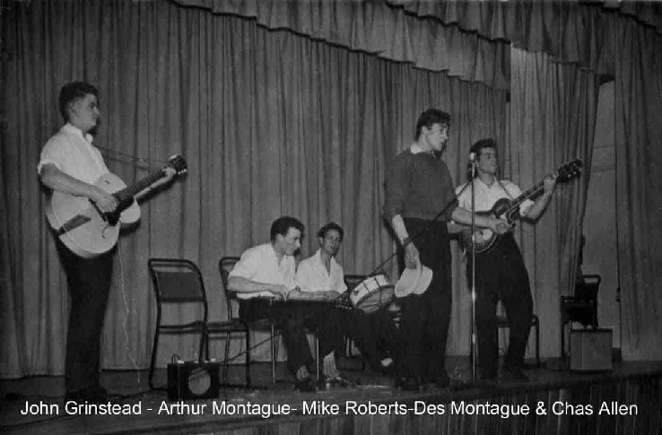 and one drum, all they could afford. L-R: John Grinstead - Hofner President, Arthur Montague - Selmer laptop guitar, Mike Roberts - Drum, Des Montague - Vocals, Chas Allen - Hofner Club 60 |