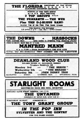 The Florida Three local Sussex groups appearing Saturday night at a Teen Scene beat festival - The Peasants and the Web from Brighton, and the DJ Blues Band from Crawley, with Brighton group The Extremes appearing on Sunday. The Downs Sunday appearance by chart topping band Manfred Mann, plus ad for Tony Jackson and the Vibrations the following week. The Vibrations included ex-Giants drummer Paul Francis. The Deanland Wood Club Lewes group The Shades appearing on Wednesday. The Starlight Rooms Throughout the majority of 1965 the Saturday night and Sunday night spots at the Starlight Rooms were held by two of the South Coast’s professional bands - The Untamed from Worthing and the Tony Grant Group from Brighton. |