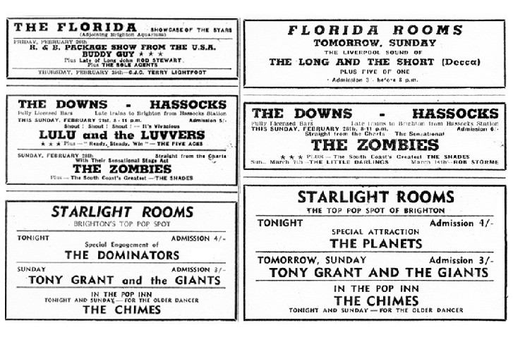 & the Short plus Five of One, Lulu & the Luvvers and The Zombies in consecutive weeks at the Florida and the Downs, and The Dominators, The Planets, Tony Grant & the Giants in The Starlight Rooms plus The Chimes in Pop Inn. |
