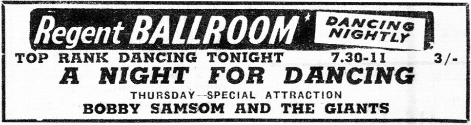 Regent Ballroom advertisement for Bobby Sansom (mis-spelt in the ad) and The Giants.