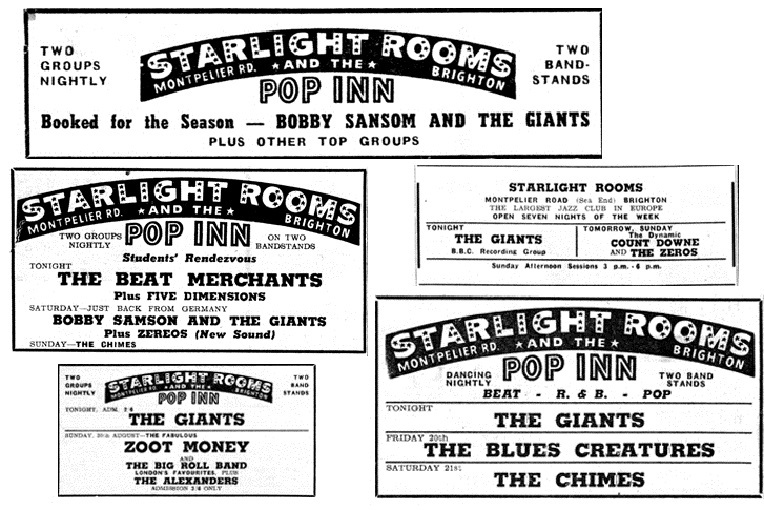 Starlight Rooms ads for The Giants (with Bobby Sansom's name mis-spelt in one ad).